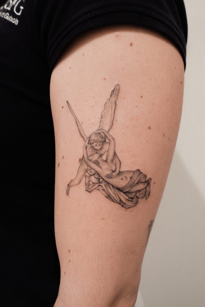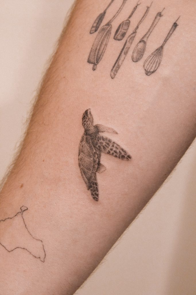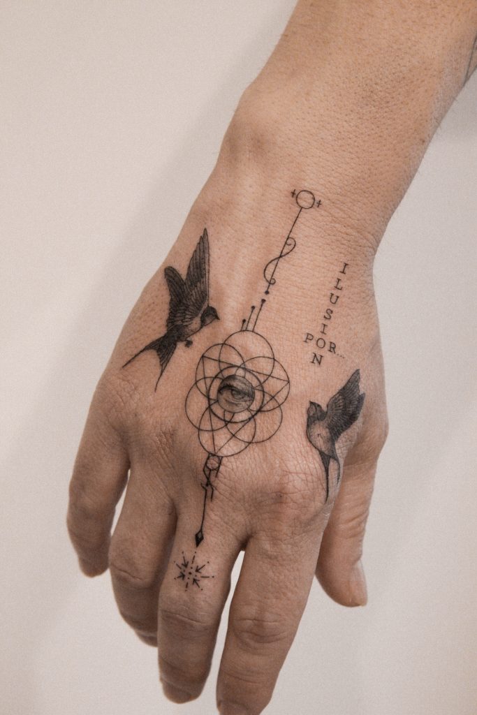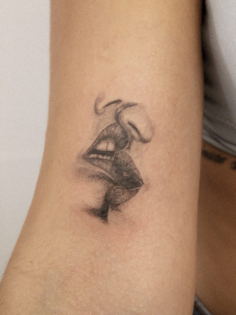 Sus tatuajes destacan por su suave y precisa línea y la sutileza en la aplicación de las sombras.